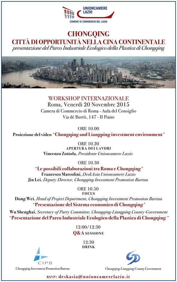 Unioncamere Lazio ha il piacere di invitarvi al workshop internazionale: “CHONGQING – CITTÁ DI OPPORTUNITÁ NELLA CINA CONTINENTALE. Presentazione del Parco Industriale Ecologico della Plastica di Chongqing” organizzato in collaborazione con le autorità governative ed il Promotion Bureau della municipalità di Chongqing.