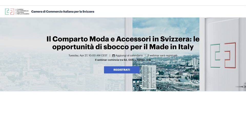La Camera di Commercio Italiana per la Svizzera (CCIS) organizza il webinar dal titolo “Il Comparto Moda e Accessori in Svizzera: le opportunità di sbocco per il Made in Italy” per presentare le opportunità del mercato svizzero nel settore del comparto Moda, strategico per l’export del Made in Italy.