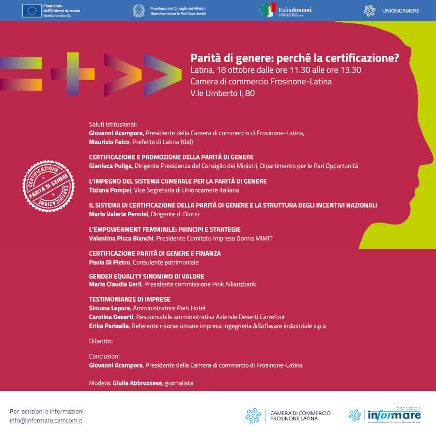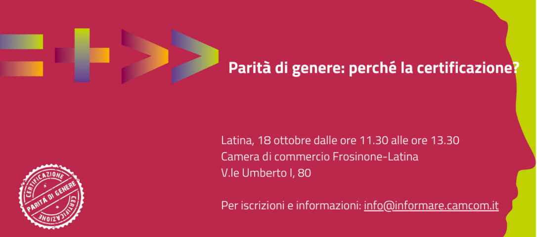 Si parlerà di Certificazione della Parità di Genere nel corso dell’evento organizzato da Unioncamere mercoledì 18 ottobre p.v. presso la Sala Consiglio della sede di Latina della Camera di Commercio Frosinone Latina.