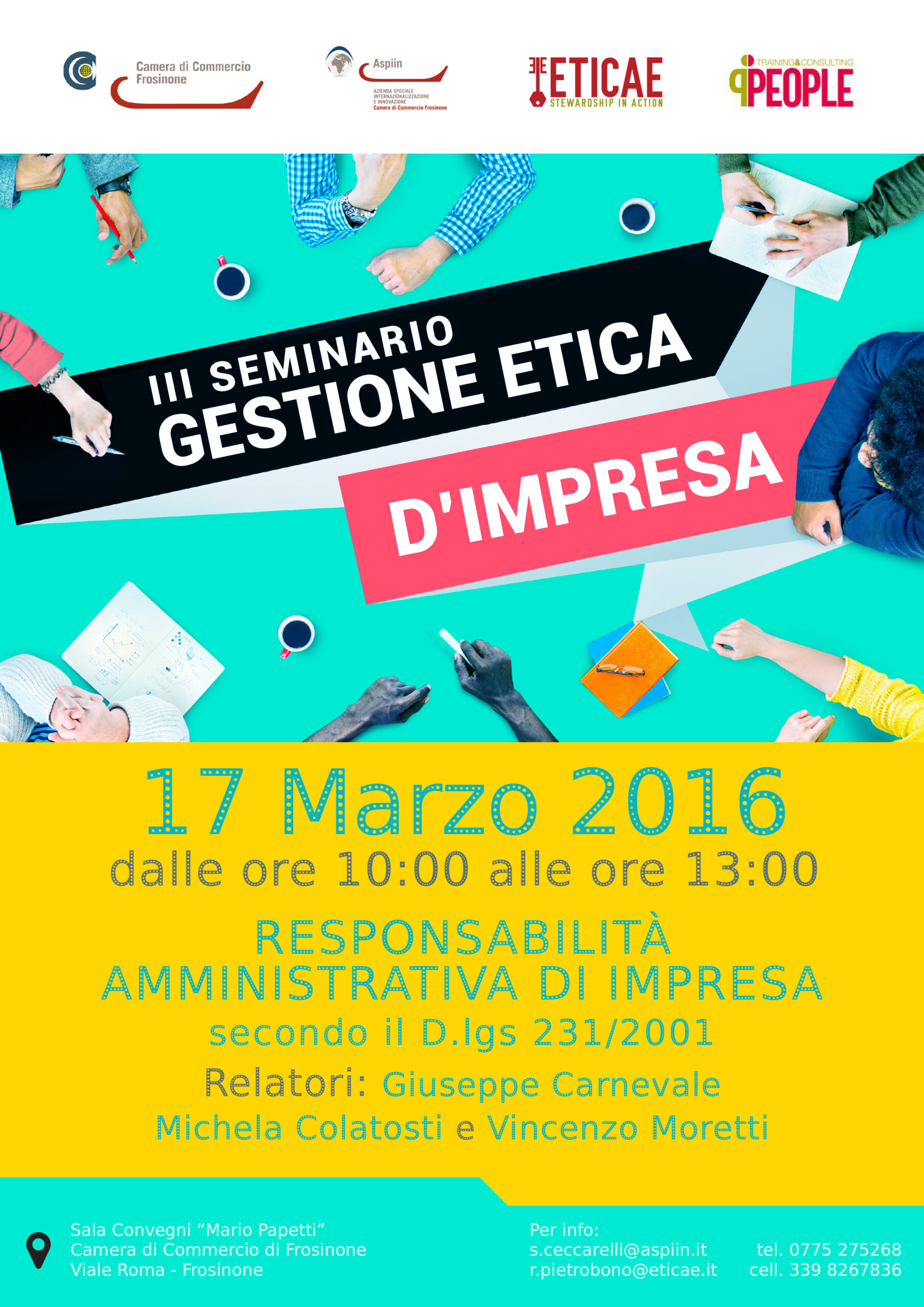 Stewardship, Certificazione Etica, Responsabilità amministrativa dell’impresa sono i temi attorno ai quali ruota il ciclo di seminari sulla gestione etica d’impresa promosso dalla Camera di Commercio di Frosinone, Aspiin Azienda Speciale Internazionalizzazione e Innovazione, in collaborazione con ETICAE – Stewardship in Action soc. coop e People Training & Consulting Srl.