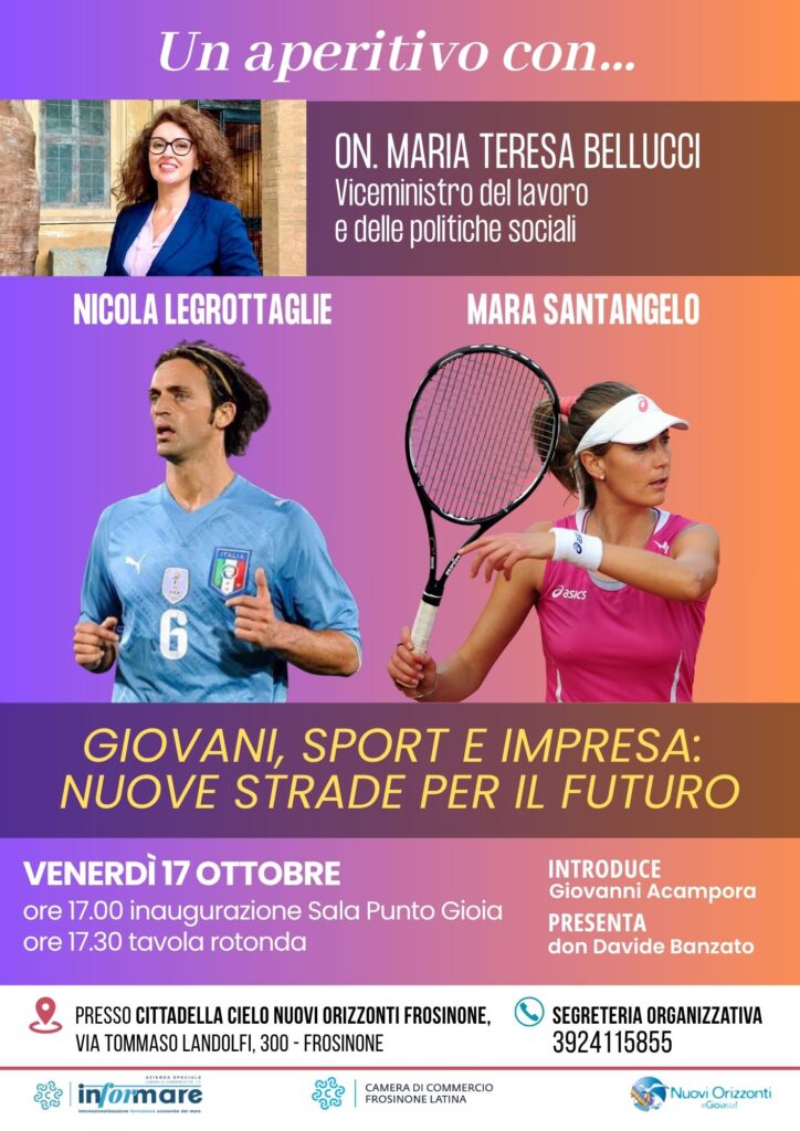 La Camera di Commercio Frosinone Latina, attraverso la sua Azienda Speciale Informare, presenta l’appuntamento del ciclo d’incontri “Un aperitivo con…” dal titolo “Giovani, Sport e Impresa: nuove strade per il futuro” , organizzato insieme a Nuovi Orizzonti, in programma venerdì 17 ottobre alle ore 17.00 presso Cittadella Cielo in Via Tommaso Landolfi 300 a Frosinone.